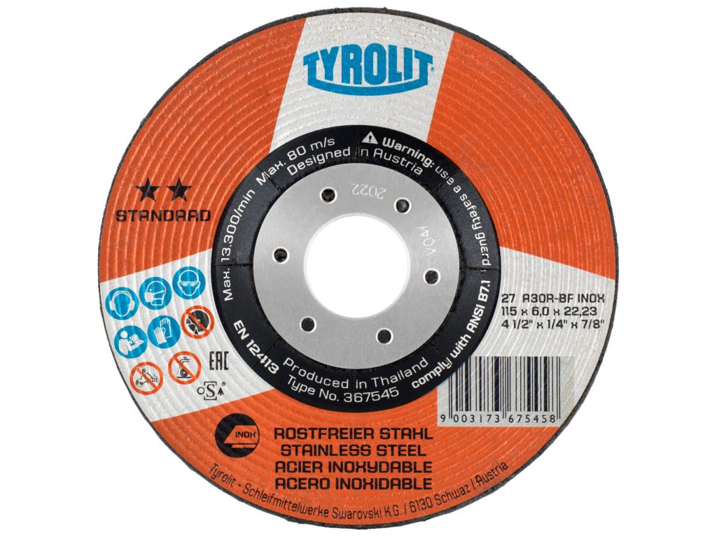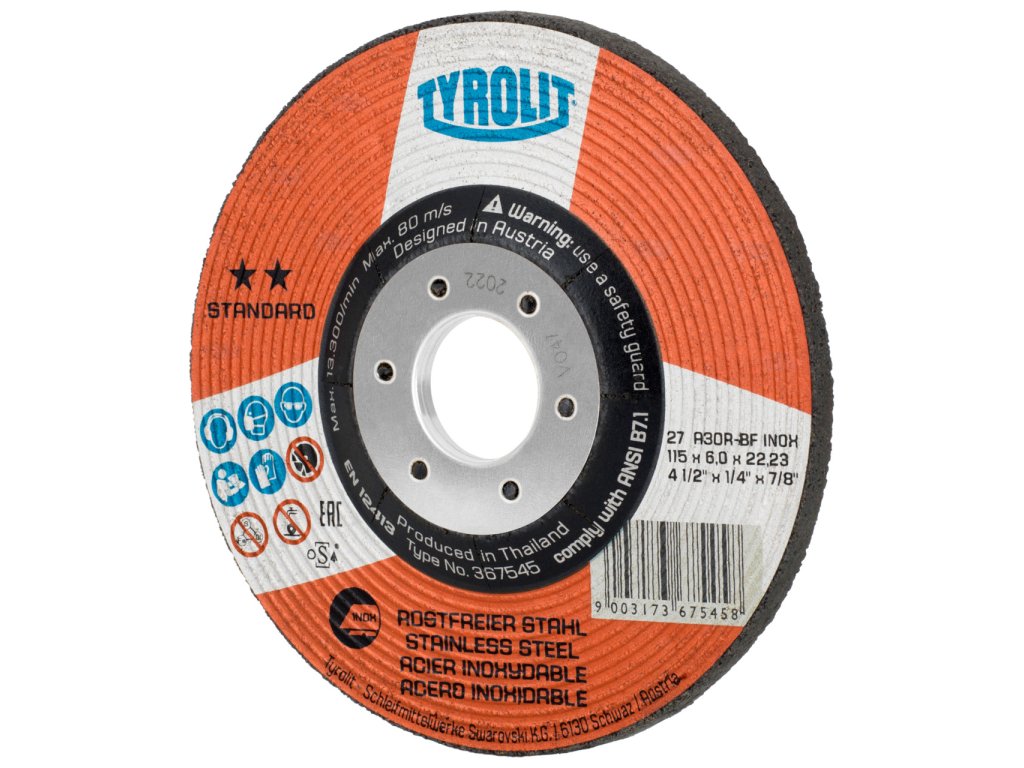 "Výkonný talířový brusný kotouč INOX je speciálně navržen pro použití s nerezovou ocelí, kombinuje dlouhou životnost s vysokou řezivostí. Toho je dosaženo použitím normálního korundu.