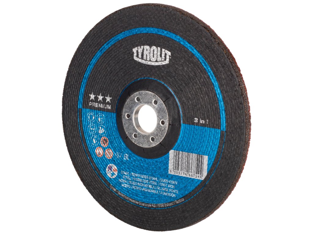 Talířový brusný kotouč PREMIUM 3v1 s oxidem zirkonu pro úhlové brusky přesvědčí svým vysokým výkonem na ocel, nerezovou ocel, INOX a lité materiály. Agresivita a dlouhá životnost umožňují velký odběr v co nejkratším čase. Díky své chemické čistotě, která neobsahuje železo, síru, chlór a fluor, je kotouč ideální pro speciální použití, jako jsou jaderné elektrárny, protože zanechává neutrální povrch obrobku.