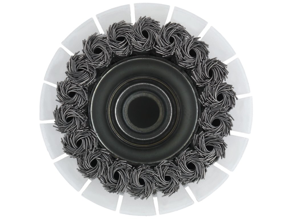 Hrncové kartáče PREMIUM SHIELD pro úhlové brusky nabízejí díky průhledné ochraně maximální bezpečnost a výkonnost při obrábění oceli. Složení z mosazného drátu dlouhodobě zabraňuje korozi. Tento nástroj je k dispozici v různých provedeních. Zatímco provedení s uzlovým drátem (DW) je předurčeno pro měkké, citlivé materiály a lehké nečistoty, drátěné kartáče s uzlovým drátem (DZ) jsou vhodné pro náročnou práci, silné znečištění a pro odstraňování barev a laků.