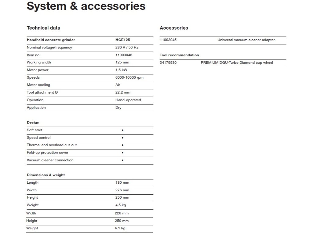 Integrovaná regulace otáček umožňuje zpracování různých stavebních materiálů a zajišťuje optimální rychlosti broušení pro každou aplikaci. Odklápěcí přední díl ochranného krytu umožňuje broušení až těsně k okrajům opracovávané plochy. Díky ergonomickému umístění rukojetí je dosahováno lepšího výsledku broušení. Kartáčový věnec a integrovaná přípojka vysavače zajišťují čistou a bezprašnou práci.